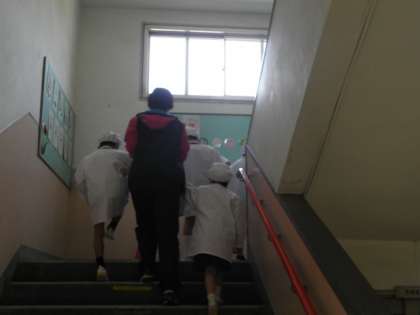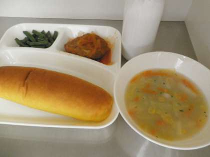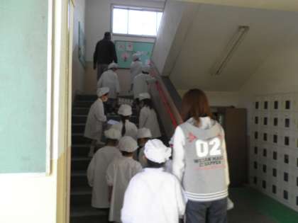 献立は、煮込みハンバーグ・コーンスープ・三度豆のサラダ・パンプキンパン・牛乳でした。1年生は2階まで、気を付けて運んでいます。