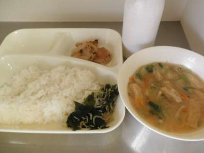 献立は、豚肉はしょうが焼き・みそ汁・じゃこわかめ・ごはん・牛乳でした。