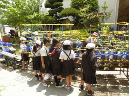 2年生が、ミニトマトとサツマイモの苗を植えました。これから毎日、水やりをして観察していきます。