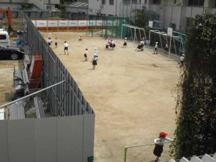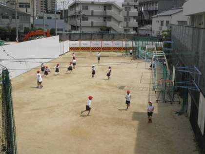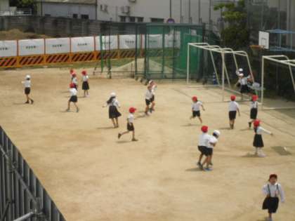 1年生が運動場で元気に遊んでいました。おにごっこをしたり、鉄棒で遊んだり、思い思いに体を動かしていました。
