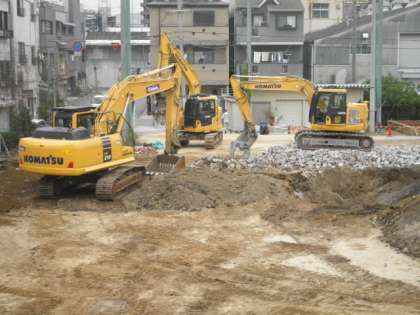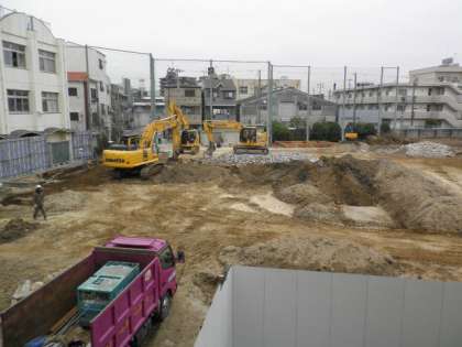 今日は重機が5台も来て、新しい穴が増えました。用事で来られた生涯学習ルームの担当者の方が廊下から見られて、運動場の変わりように驚いておられました。