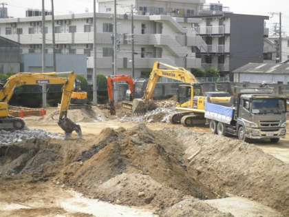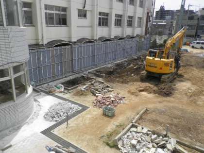 コンクリートの塊をトラックに積みこみ、東校舎前の花壇の辺りを掘る作業をしています。