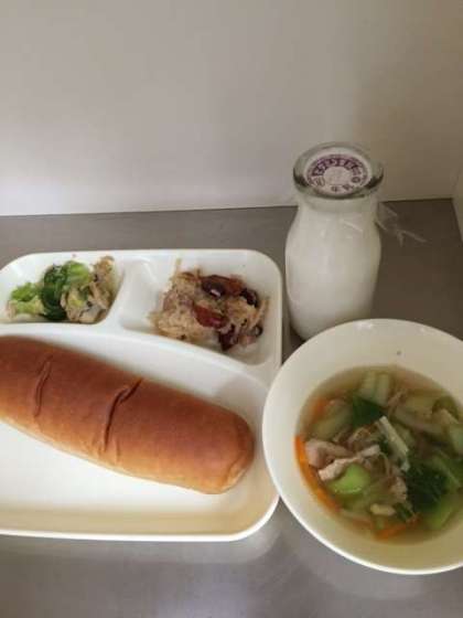 献立は、金時豆の中華おこわ・中華スープ・ツナと野菜のオイスターソース炒め・黒糖コッペパン・牛乳でした。