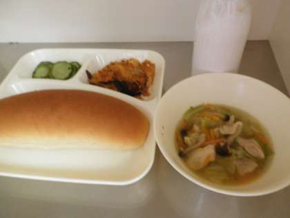 22日:じゃがいものミートグラタン・スープ煮・きゅうりのバジル風味サラダ・コッペパン・牛乳