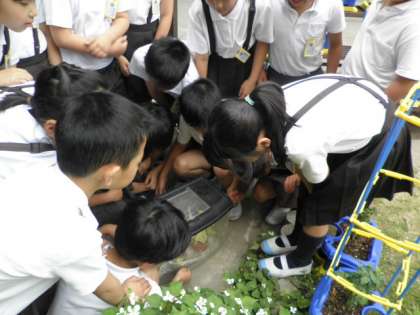 今週はモンシロチョウの誕生ラッシュです。講堂前で3年1組の子どもたちが「バイバ〜イ」と手を振って、モンシロチョウを見送りました。