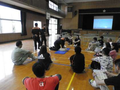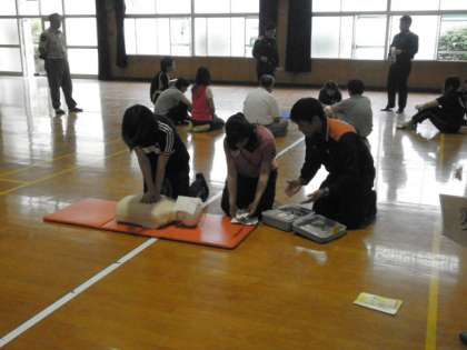 救急隊員から応急手当の手順を教わり、実技研修をしました。