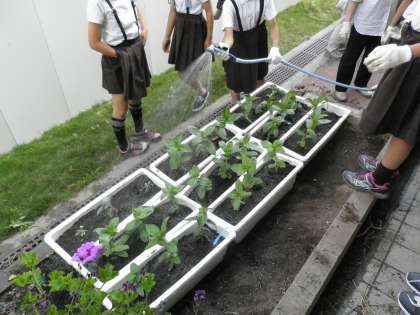 本日は一回目の栽培同好会の活動でした。はじめに、地域の栽培活動の皆さんと栽培同好会の児童が顔を合わせ、自己紹介と意気込みを語りました。その後、地域の方に教えていただきながら、草抜き・土の入れ替え・苗の植え替えを児童のみんなは熱心に取り組んでいました。最後に花に水やりをして、本日の活動は終了。来週から、栽培同好会のみんなで協力して世話をし、きれいな花を育てますので、学校に来られたらぜひご覧ください。