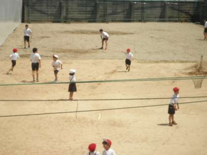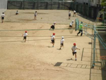 運動場の奥では6年生がボール遊び、手前側では1年生がおにごっこをして元気に遊んでいました。