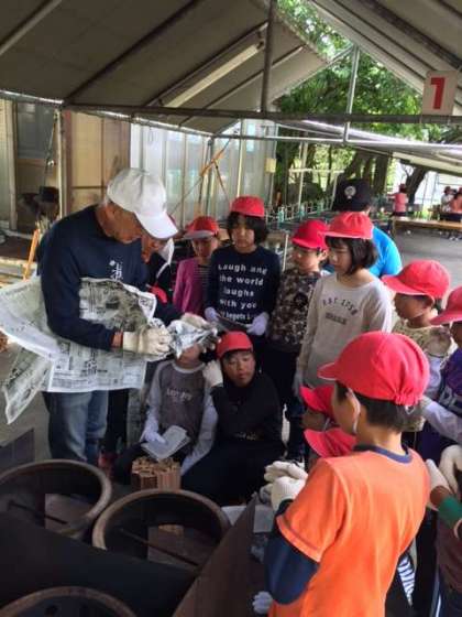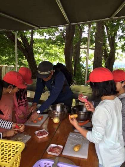 カレー作りが始まりました。火おこしのチームと材料を切るチームに分かれて、活動しています。
