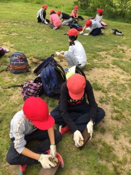 2日目午後の活動、焼き板作りが始まりました。ススを落として板を磨いていきます。