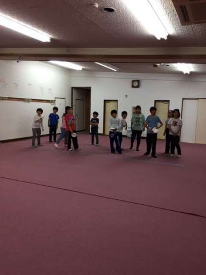 2つめの種目は、紙皿で作った円盤投げです。大広間の端まで投げるチームが続出し、接戦です。