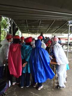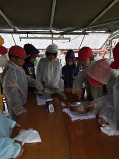 小雨が降っているので、食堂で説明を聞いてから野外炊飯場でアイスクリーム作りを始めました。