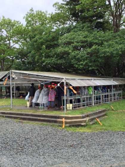 霧がはれて山の稜線が見えてきました。子ども達は賑やかにアイスクリーム作りをしています。