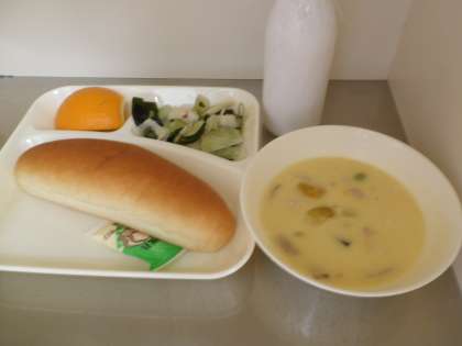 献立は、かぼちゃのクリームシチュー・ミックス海そうのサラダ・オレンジ・コッペパン・マーガリン・牛乳でした。
