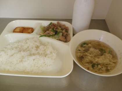 15日 豚肉と野菜のいためもの、かき玉汁、あつあげのみそだれかけ、ごはん、牛乳