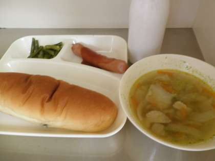 16日 ウィンナーーのケチャップソース、スープ、三度豆のサラダ、レーズンペン、牛乳