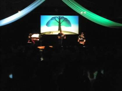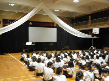 影絵劇団かしの樹の公演を見せていただきました。子どもたちは講堂に入った途端、いつもと違う雰囲気にびっくり!