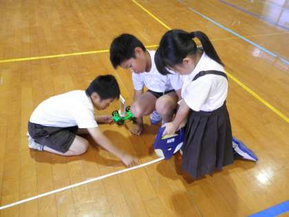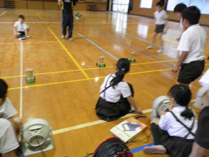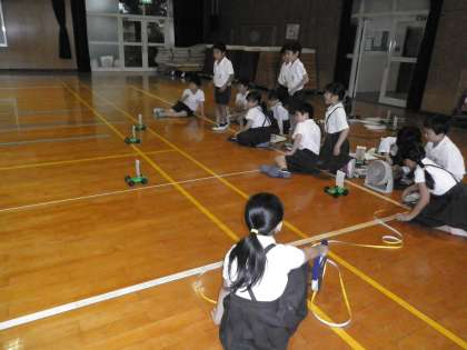 3年1組が講堂で理科「風の力をしらべよう」の実験をしていました。