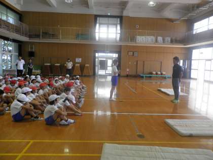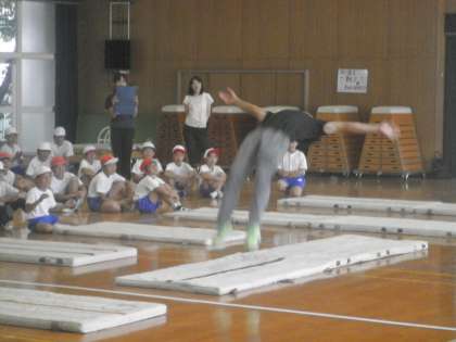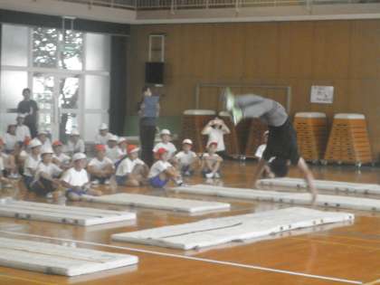 藤田先生が、後方倒立回転(バク転)と後方宙返り(バク宙)をみせてくださいました。子どもたちは歓声を上げ、アンコールの拍手が起こりました。最後には握手攻め。「アンコールを受けたのは初めてです。」と藤田先生にも喜んでもらえたようです。暑い中、子どもたちに熱心に教えてくださり感謝いたします。