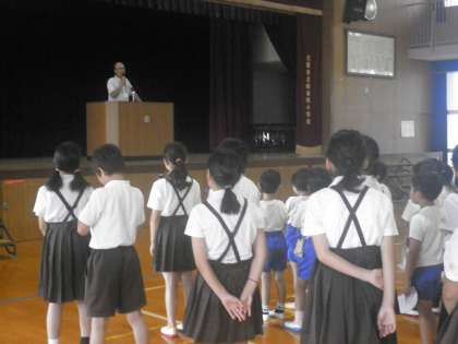 校長先生から二つお話がありました。ヒアリについて、猛毒をもつアリなので注意が必要です。日本にもともといるアリと区別が難しいので、アリを見かけても触らないようにしましょう。もうひとつは、先週の大雨のため九州地方で大きな洪水被害が出ています。この地域も地面が低いので、大雨や雷警報が出たときは家で安全に過ごし、自分の身を守るようにしましょう。