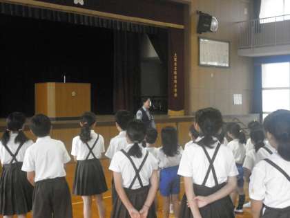 今日の児童集会で、港警察署から二人の警察官が来てくださり、夏休みに向けて自転車の乗り方について話してくださいました。1.信号をまもること 2.二人乗りをしないこと 3.「止まれ」の標識を守って、右左右を確認すること というお話でした。自転車に乗るときには安全に気をつけて、けがをしないように楽しい夏休みを過ごしてほしいです。