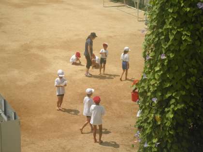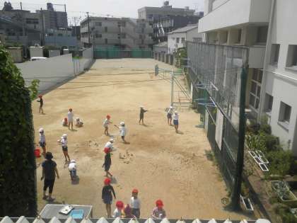 生活科の単元で「なつだ あそぼう」の学習をしました。水をまいたり泥だんごを作ったりしました。