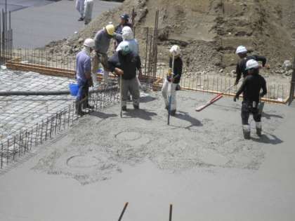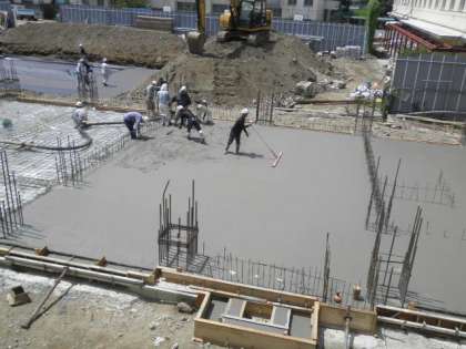 校舎の基礎部分に新しいモルタルを流し込んでいます。水平に均すのは職人技です。