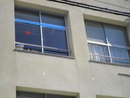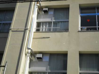 道路側の教室の窓には、緊急侵入口のマーク▼が入りました。また、人が侵入できるように窓の大きさが大きくなっています。換気扇も、廊下側から道路側に付け替えられました。