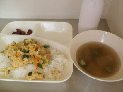 献立は、親子丼(卵)・とうがんのすまし汁・金時豆の煮もの・ごはん・牛乳でした。