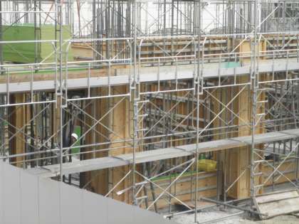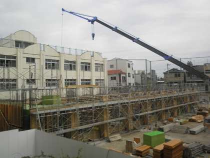 鉄筋と資材が組み上げられ、2階の床の高さぐらいまで柱のようなものが見えます。
