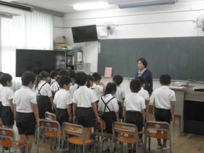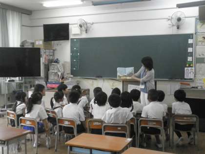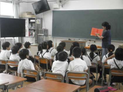 今日は1年1組で「むしたちのうんどうかい」、1年2組で「いいからいいから」、2年1組で「うみのいえのなつやすみ」などの絵本を読んでくださいました。子どもたちはとても集中して聞いていました。