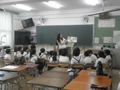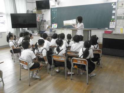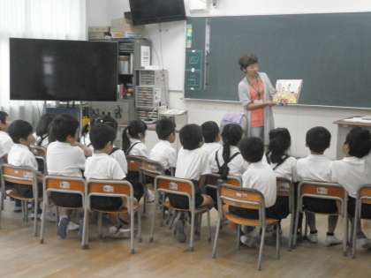 今日は、2年2組で「ぼくんちのゴリ」、1年1組で「せんたくかあちゃん」、1年2組で「いいからいいから」などの絵本を読んでくださいました。