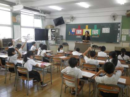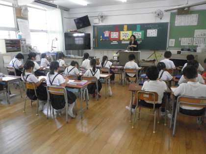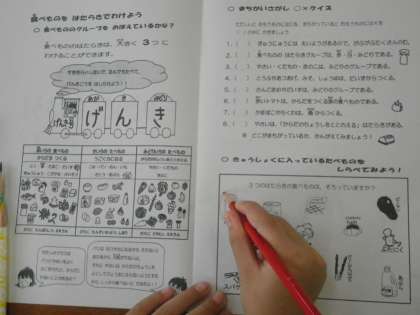 2年生が「たべものをはたらきでわけよう」と、赤(主に体をつくる)・黄(主に熱や力のもとになる)・緑(主に体の調子を整える)の食べ物の仲間わけを考えました。