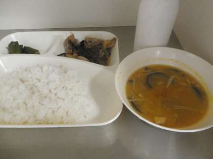 12日:豚肉の甘辛焼き、みそ汁、オクラのおかかいため、ごはん、牛乳