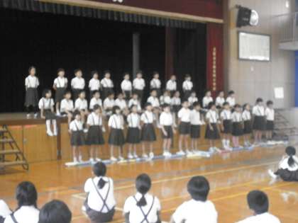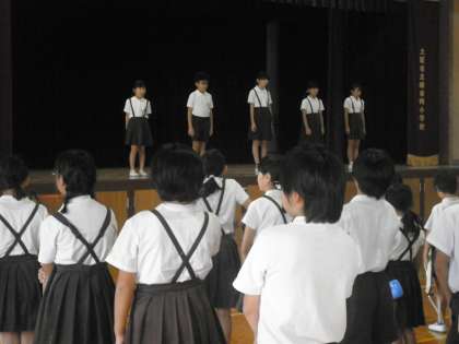 集会委員会が司会をしています。今日は、2年生の学年発表でした。