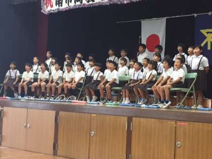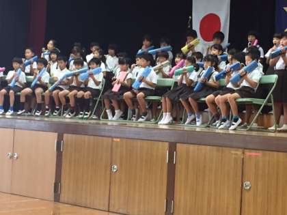 学校を代表して2年生が敬老のつどいに出演しました。お祝いの言葉、歌、合奏、そして詩の群読を心を込めて発表しました。
