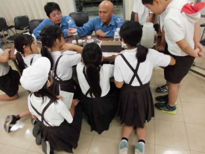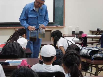 微生物の働きを使った下水処理の実験も見せていただきました。結果はみごと成功!汚泥は沈殿し、きれいな水が分離されるのを全員で確認することができました。