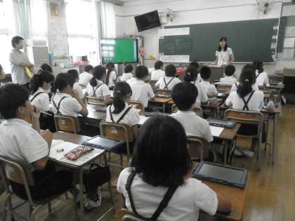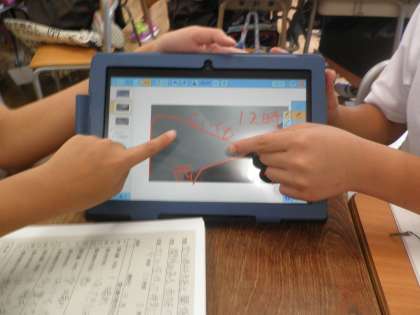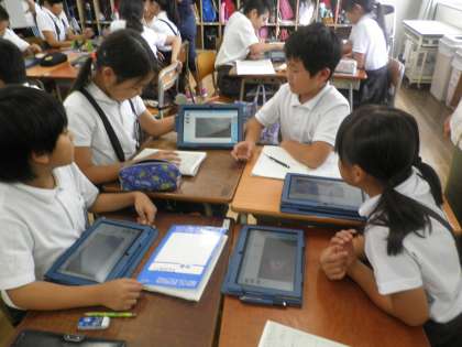 5年生は理科「天気の変化」を公開授業で行いました。事前にタブレット端末で雲の様子を撮影し、雲の量や動きなどの変化から、天気の変化との関係を話し合いました。