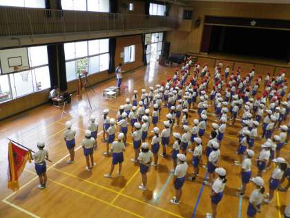 講堂で、運動会の開会式や閉会式の練習をしました。