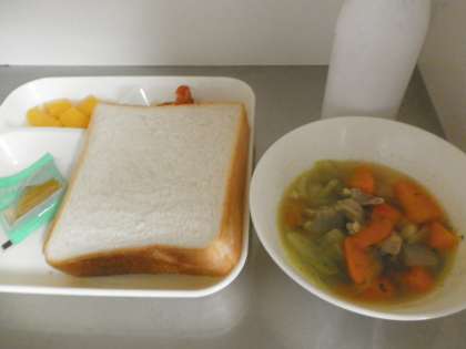 黄桃(カット缶)、食パン、りんごジャム、牛乳