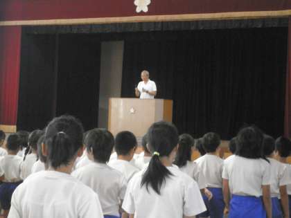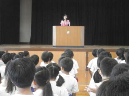 校長先生から、「もうすぐ運動会です。体の調子を整えて、元気に参加できるようにしましょう。」とお話がありました。続いて、当番の土手下先生が、今月の生活目標「進んであいさつをしよう」について話されました。