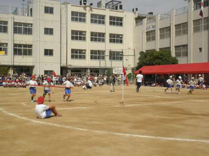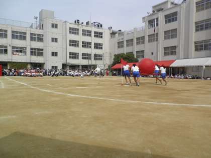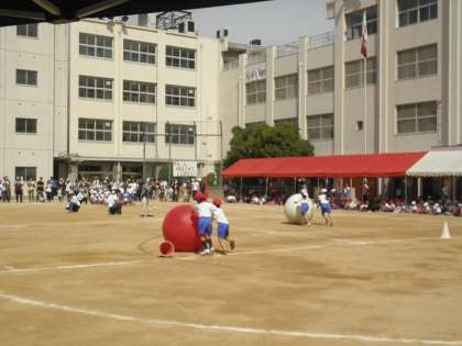 同じ大玉でも、運ぶ競技と転がす競技では難易度が違います。棒を使う競技「台風の目」もチームで協力しないといけません。