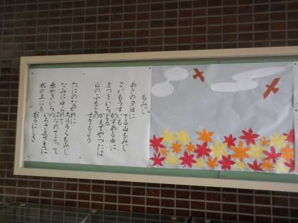 今日は雨がぱらついて、気温が下がって一気に秋が深まったようです。玄関掲示はもみじの紅葉、4年生が担当しました。校長先生が「もみじ」「ちいさい秋みつけた」の歌詞を書いてくださいました。