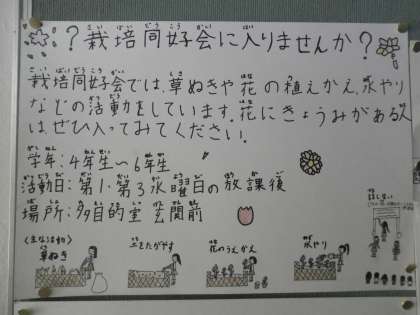 毎月第1、3水曜日の放課後に活動している栽培同好会が、ポスターを作成しました。保健室横の掲示板に貼りだしていますので、ぜひご覧ください。