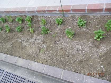 花壇の部分の工事も終わり、整地していただいた花壇に、今日はノースポールを植え替える活動をしました。慣れた手つきで素早く花の苗をビニルポットから出して植え替えることができました。