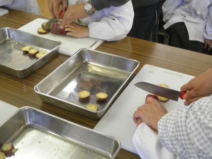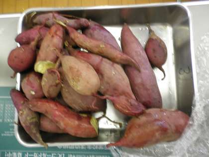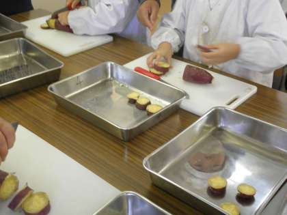 学習園で収穫したサツマイモを使って、「おいもパーティー」をしました。あらかじめふかしたサツマイモを輪切りにしました。