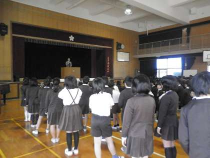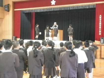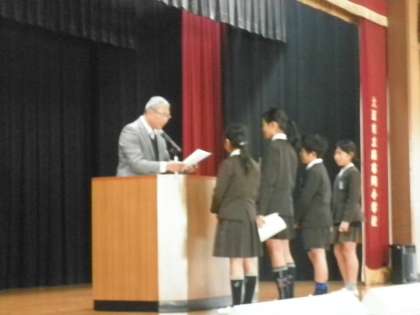 校長先生のお話は、「1あいさつカードについて、保護者の皆さんから一言書いていただいたこと、これからもあいさつを続けること 2寒くなって体調をくずす児童が増えてきたこと、手洗いやうがいをしっかりして健康に気をつけ、土曜日の学習発表会をがんばってほしいこと」でした。そして、嬉しい報告がありました。「理科の自由研究」と「税に関する習字」で表彰された児童4名が賞状を受け取りました。
