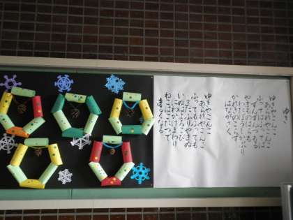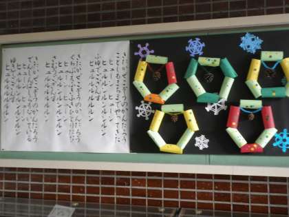 2年2組が冬の掲示を作りました。両側の歌詞は、校長先生が書いてくださいました。童謡「ゆき」とNHK「みんなのうた」でおなじみの「北風小僧の寒太郎」です。