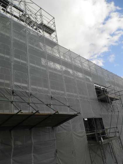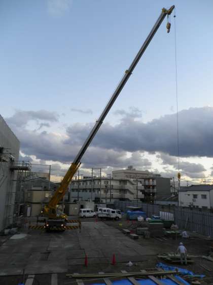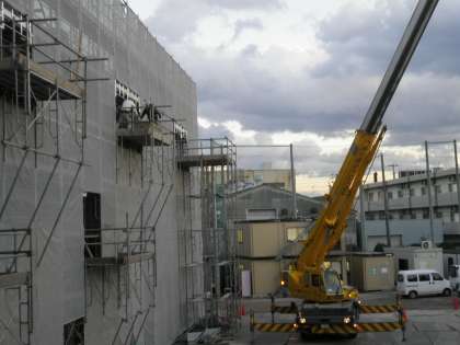 シートが張られているので中の様子はわかりませんが、大きなクレーン車が来て資材を運びこんでいました。