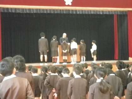今日の児童朝会では、2つの表彰がありました。読書感想文コンクールと子ども会ソフトボール港東杯の表彰です。南市岡ソフトボールチームは、準優勝です。おめでとうございます。準優勝楯は、玄関のショーケースに飾っていますのでごらんください。
